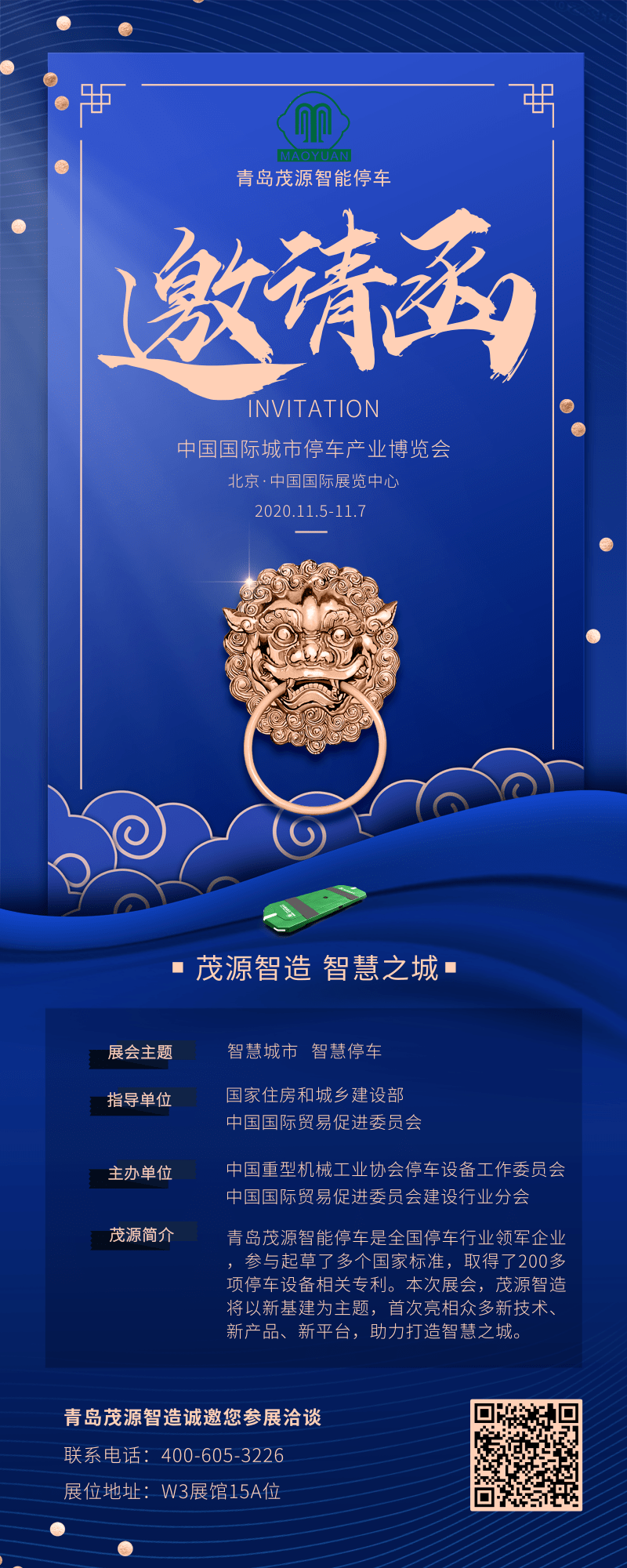2020年11月5日-7日,欢迎您莅临北京·中国国际展览中心(新馆)W3-15A,青岛茂源停车设备制造有限公司展位,参观交流、洽谈合作。